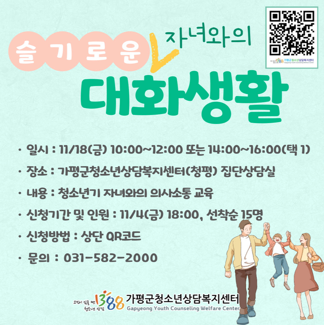 가평군청소년상담복지센터(센터장 민혜숙)는 11월 18일 관내 청소년 자녀를 둔 보호자를 대상으로 ‘슬기로운 자녀와의 대화생활’ 교육을 실시한다고 전했다.