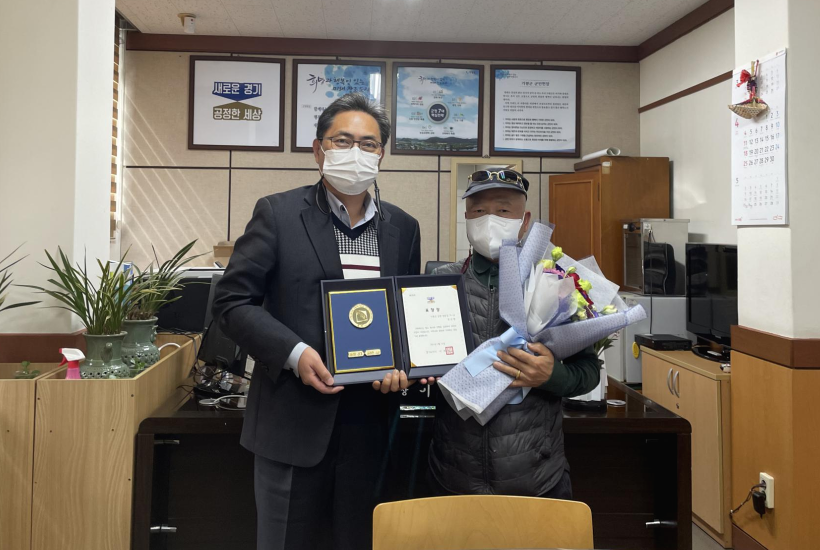 상면 행정복지센터에서 환경미화원으로 근무 중인 권선행 주무관이 지난 2021년 3월 31일 경기도지사로부터 선행도민 표창장을 수여받았다. 표창장은 코로나19 확산 및 사회적 거리두기로 인해 상면장이 간소하게 전수 하였다.