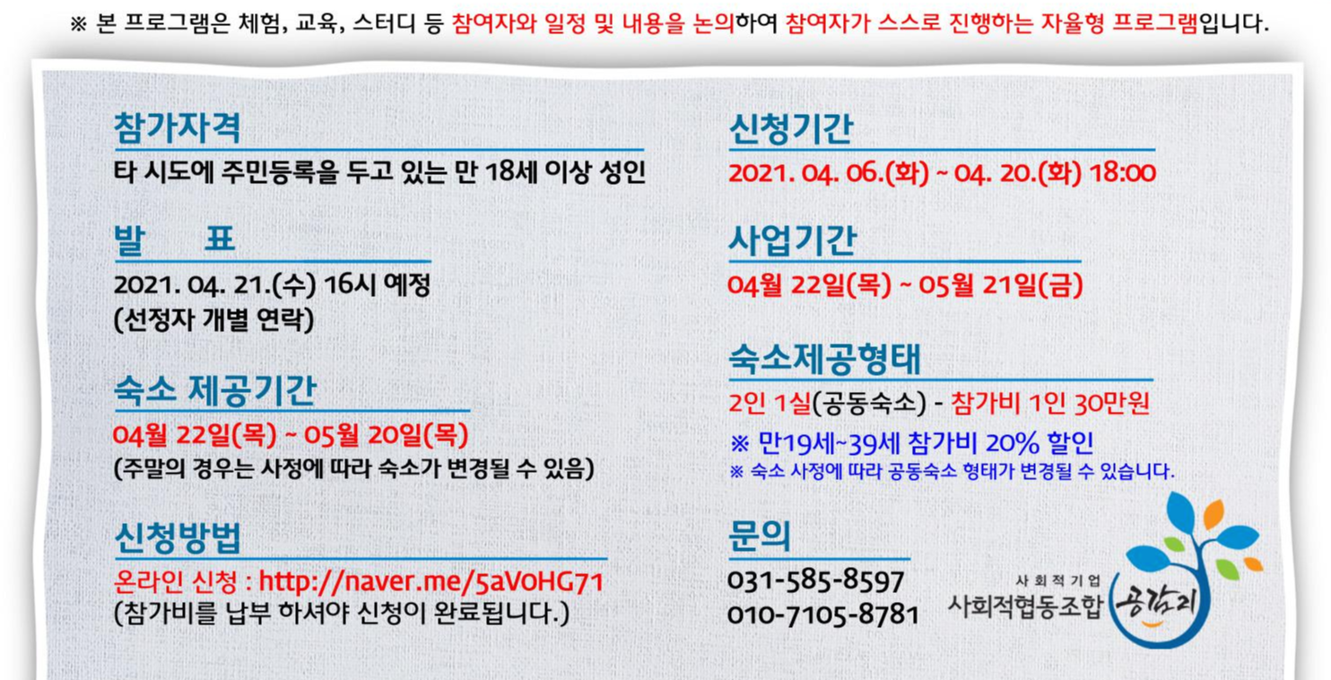 모집기간은 4월 20일까지이며, 온라인( http://naver.me/5aV0HG71 )으로만 신청이 가능하다. 신청대상은 타 시도에 주민등록을 두고 있는 만 18세 이상 성인으로 4월 22일부터 5월 21일까지 프로그램에 참여하게 된다. 프로그램에 대한 자세한 내용은 블로그( https://blog.naver.com/haharara27 ) 또는 가평귀촌귀농학교 홈페이지( www.gp8597.com )을 참조하면 된다.